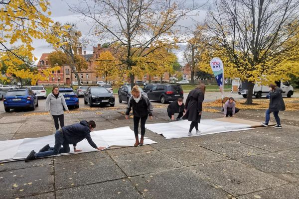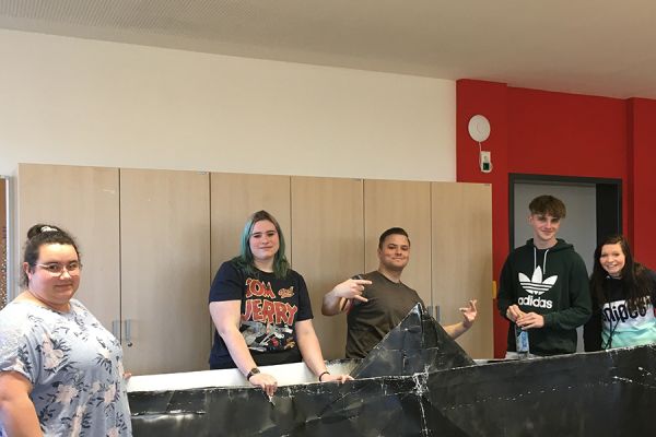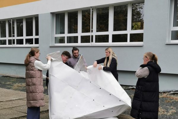 Am 21. Oktober 2024 wurde das Kunstprojekt „100 Boote – 100 Millionen Menschen“ auch bei uns an der Schule lebendig. Unter der Anleitung von Ruben Herm und mit der Unterstützung von Gerald Stöter (Ministerialrat a. D.) falteten wir ein fünf Meter langes XXL-Faltboot. Dieses Boot ist Teil eines deutschlandweiten sozialkritischen Kunstprojekts der AWO Sachsen-Anhalt, das die weltweite Flüchtlingsproblematik in den Fokus rückt.