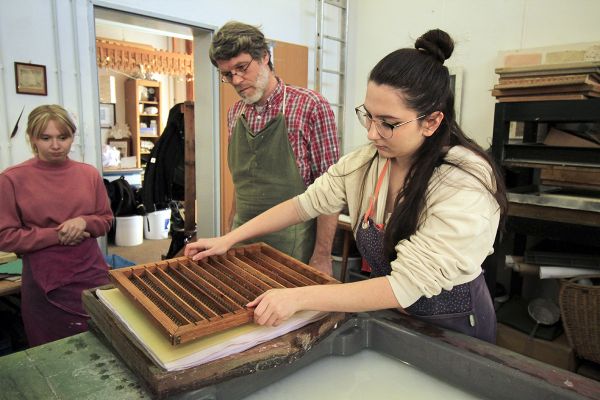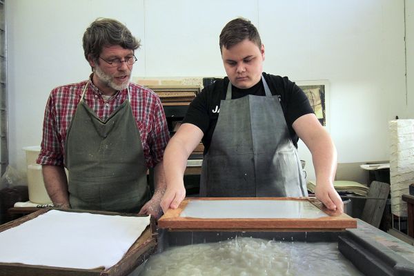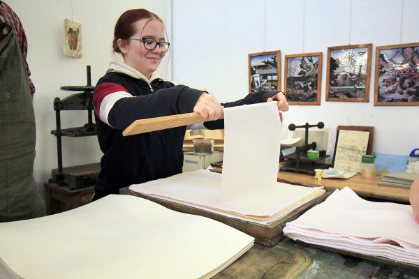 Nachdem das Wasser größtenteils abgelaufen war, konnte der Rahmen vorsichtig abgenommen werden und das noch nasse, aber bereits ausreichend feste Papier wurde auf ein Baumwolltuch gestürzt. Da das nasse Papier sehr gut am Tuch haftete, ließ sich das Sieb sehr leicht abnehmen und auf ein Neues verwenden. Das Papier wurde anschließend mit einer Filzmatte bedeckt und das nächste Papier konnte geschöpft und darauf abgelegt werden. Der dadurch entstandene Stapel wurde anschließend in eine große Presse gelegt. Durch den starken Druck der Presse lief nun das überschüssige Wasser ab.