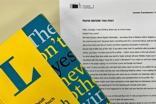 Als am Freitag, 22.11.2024, gegen 14:00 Uhr eine Mitarbeiterin der Europäischen Kommission in unserer Schule anrief, konnten wir unser Glück kaum fassen, denn wir durften am EU-weiten Übersetzungswettbewerb teilnehmen. Juvenes Translatores ist ein Wettbewerb für die besten Nachwuchsübersetzer/innen der Europäischen Union. Die Voraussetzungen sind Geburtsjahrgang 2007 und ein analoges Wörterbuch. Glücklicherweise konnten unsere Teilnehmenden aus dem Beruflichen Gymnasium beide Bedingungen erfüllen. Am Donnerstag, 28.11.2024, rauchten die Köpfe über kniffligen Übersetzungen und manch einer überlegte, ob denn der Großvater aus dem zu übersetzenden Text tatsächlich mit dem letzten Regen auf die Welt kam oder ob es sich vielleicht doch um eine idiomatische Redewendung handelt. (Auflösung: Letzteres ist korrekt.)