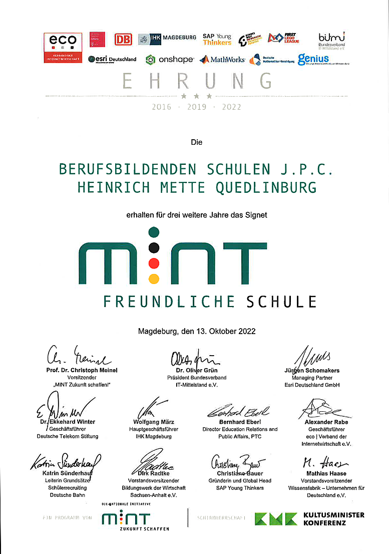 Ich konnte an einer Online-Veranstaltung zur erneuten Verleihung des Titels „MINT – freundliche Schule“ teilnehmen. Die BbS J.P.C. Heinrich Mette ist damit eine von 18 MINT-freundlichen Schulen in Sachsen-Anhalt.